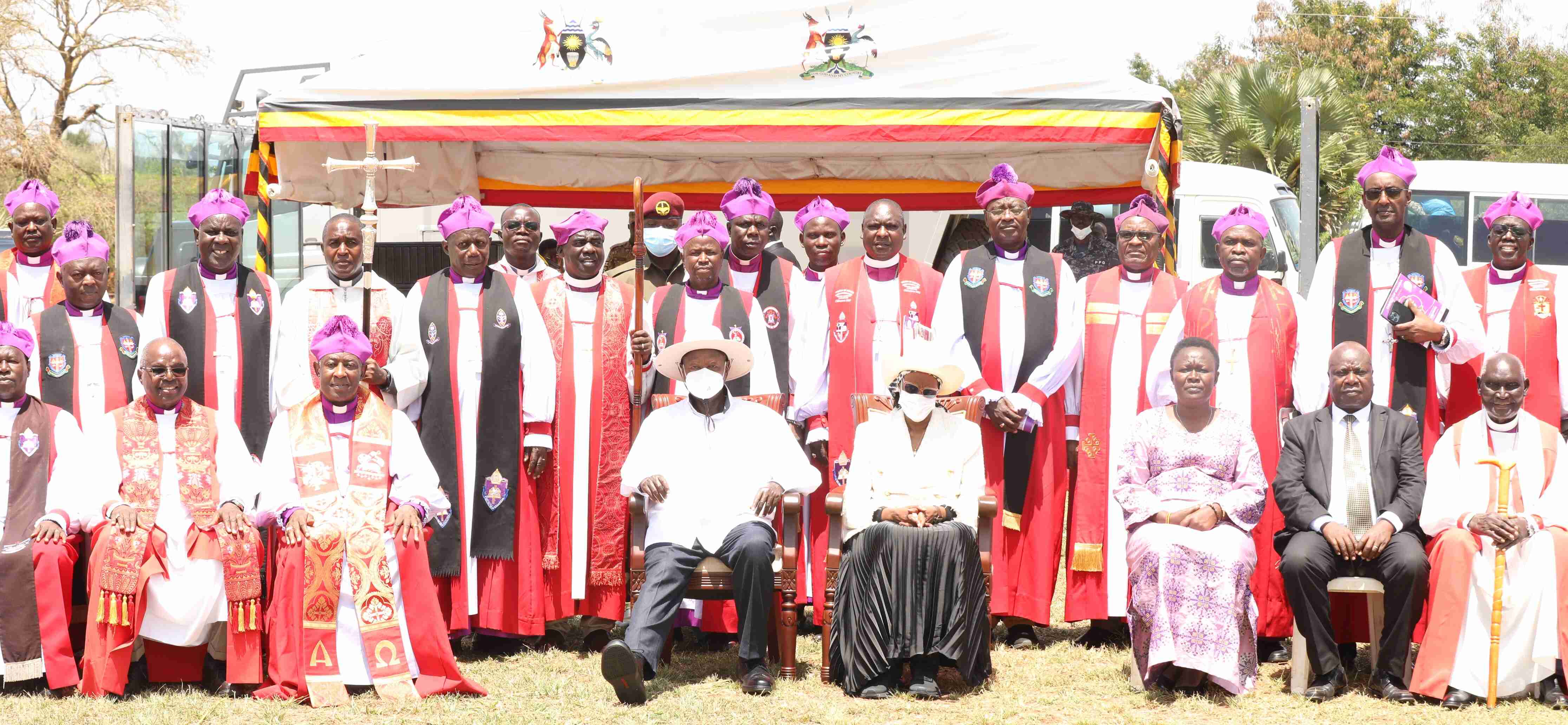 HE. Yoweri Kaguta Museveni poses for a photo with the Archbishop of the Church of Uganda, The First Lady, The Minister of State for Ethics and Integrity, and the Bishops at the 49th Celebration of St.Janani Luwum