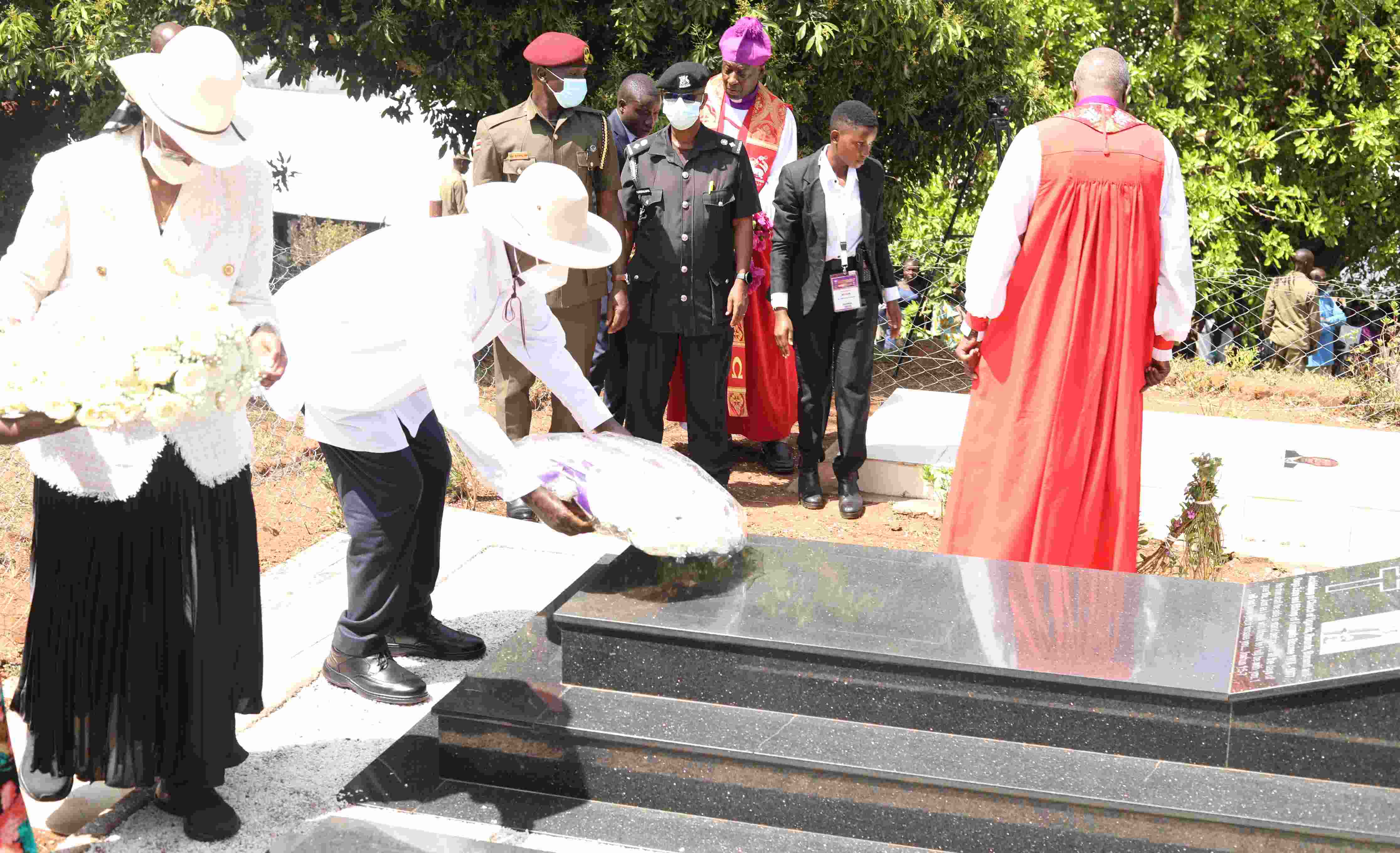 HE. Yoweri Kaguta Museveni and the First Lady Hon. Janet Kataaha Museveni lay a wreath on the tombs of St. Janani Luwum and Mary Luwum at the 49th Anniversary of St. Janani Luwum